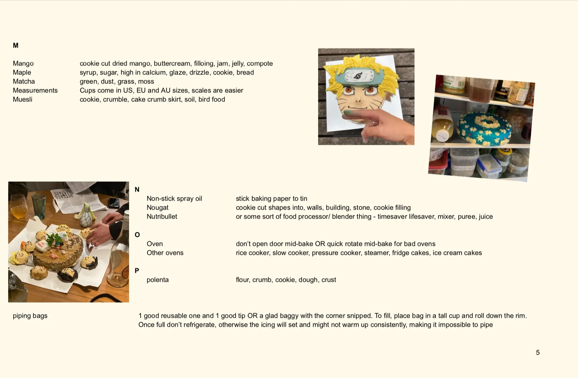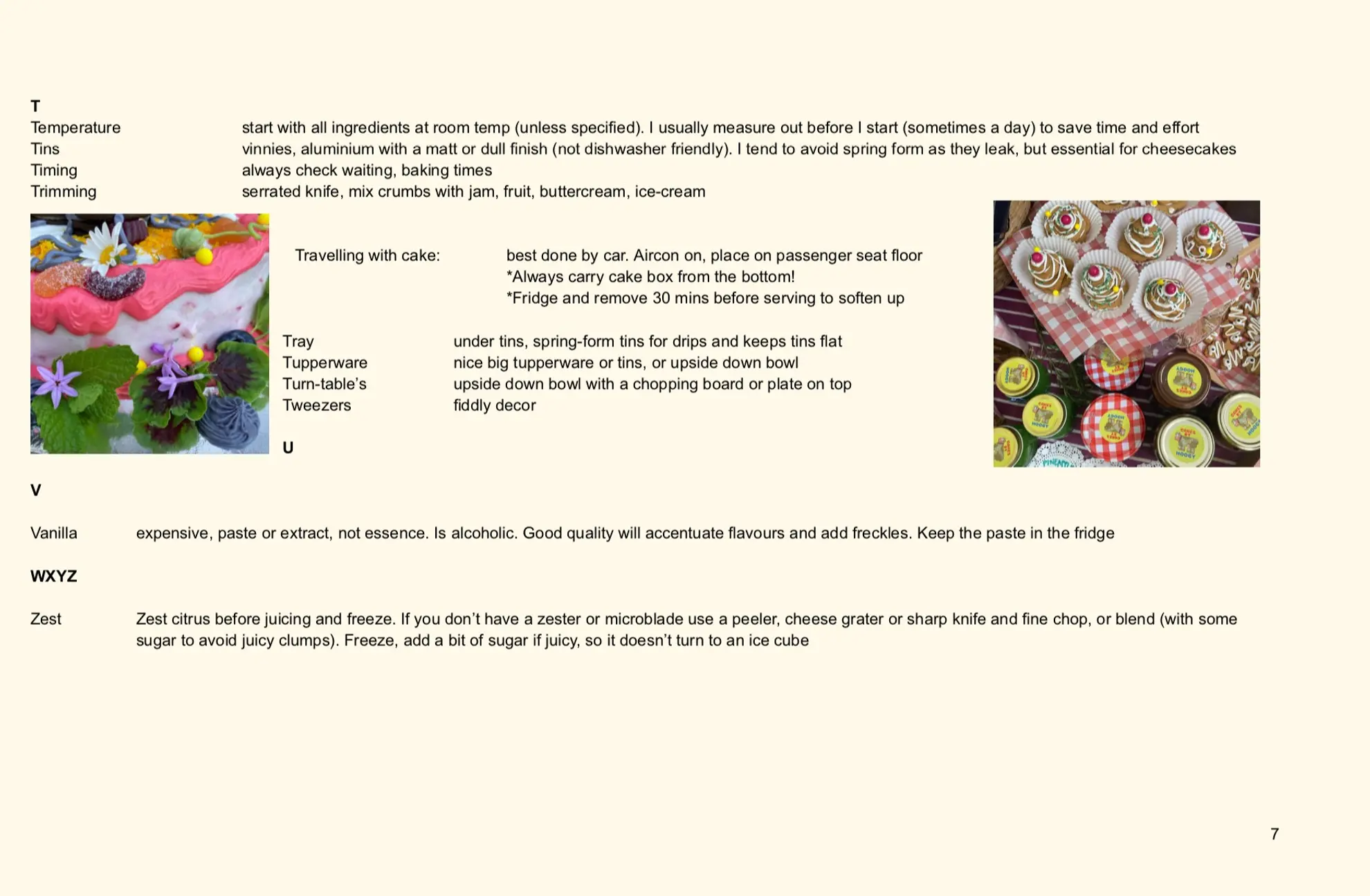 Below is a glossary of cake hacks in the format of a cookbook index. They are some tips and tricks from my cookbook scribbles to motivate and encourage fellow cake enthusiasts, and demystify the world of baking.