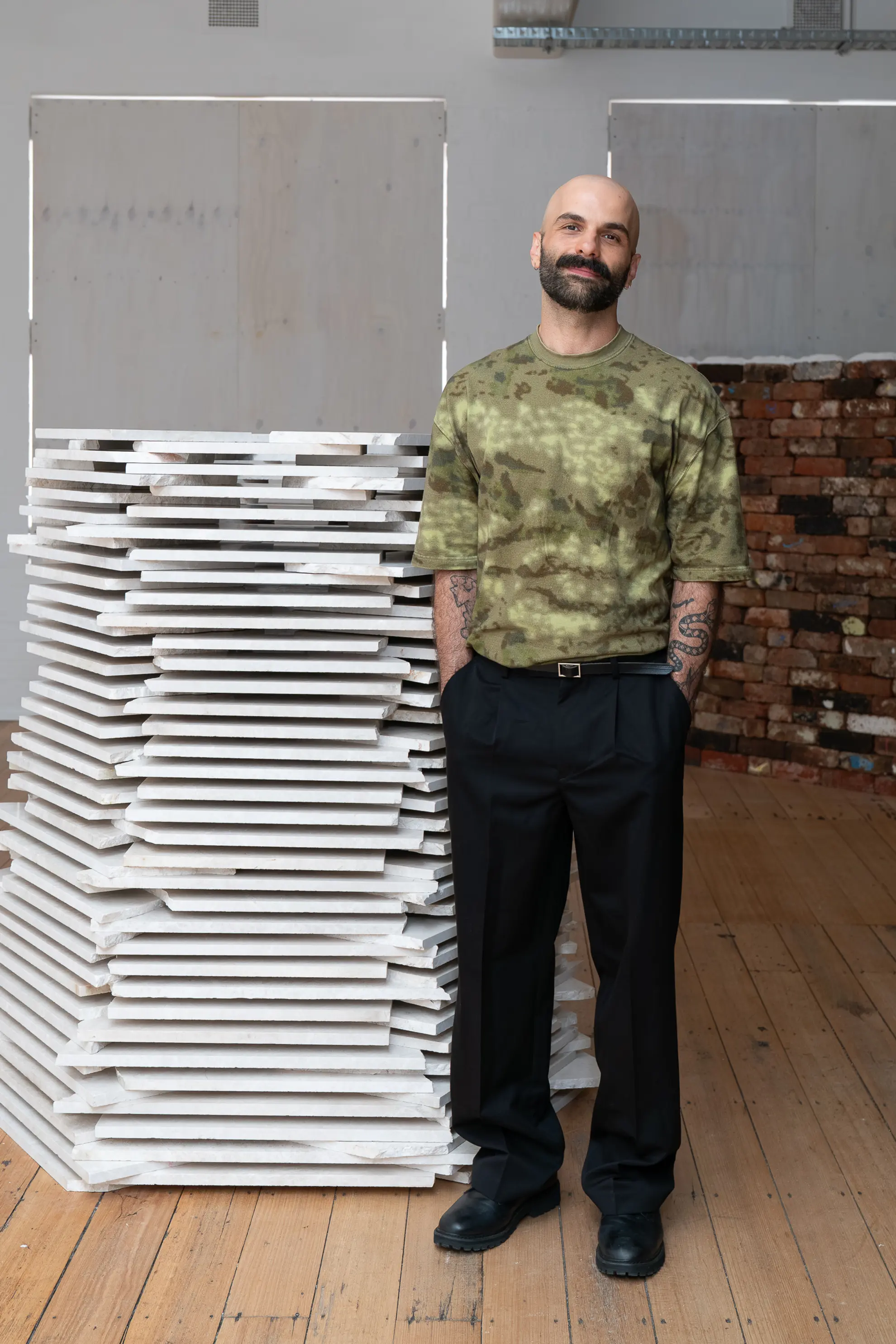 Zand’s decision to use marble was intentional; a decision to veer away from the colonial logics of extracting local materials on stolen land. Yet the off cuts he chose to use were of marble imported from Greece, Italy and elsewhere brought here to make luxury benchtops for kitchens and bathrooms. In a very literal sense, they are the vestiges of a process that enacts colonialisms through the act of making home. We discussed the vestigial status of these offcuts as a contrast to the figurative classical statuary and all the civilisational baggage they have come to acquire. In antiquity the Greeks colourfully painted their sculptures, but those muscles and veins were scrubbed back to pale stone bodies, sanitised for display in museums in the Enlightenment.