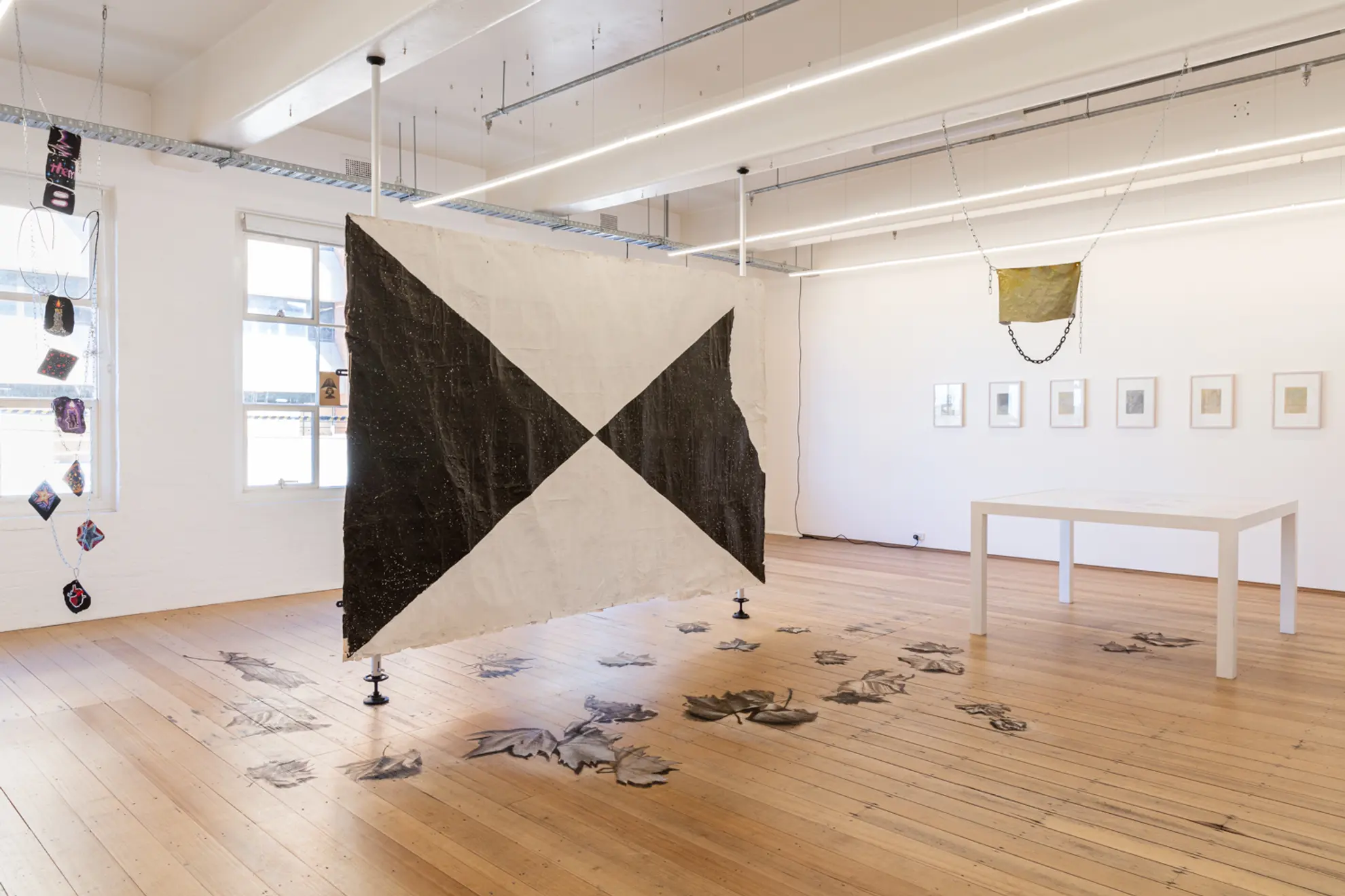 Audiences were welcomed into the gallery through a large floor-to-ceiling banner by Indra Liusuari that humorously asks, did you know there are art galleries in collingwood yards? (2023). Of course, humour is a critique, and Liusuari’s new work for Unison primes the visitor to think actively about the ethics of the artworld spaces they are entering and the gentrifying suburbs they often occupy. Markedly, the First Nations voices within the show deepen this critical engagement, questioning the restrictive nature of the Western-normative tradition of Modern art, the expectations imposed on the cultural production of First Nations people, and the sector’s all-too-slow move towards an appreciation for the complexity and power of First Nations cultures.