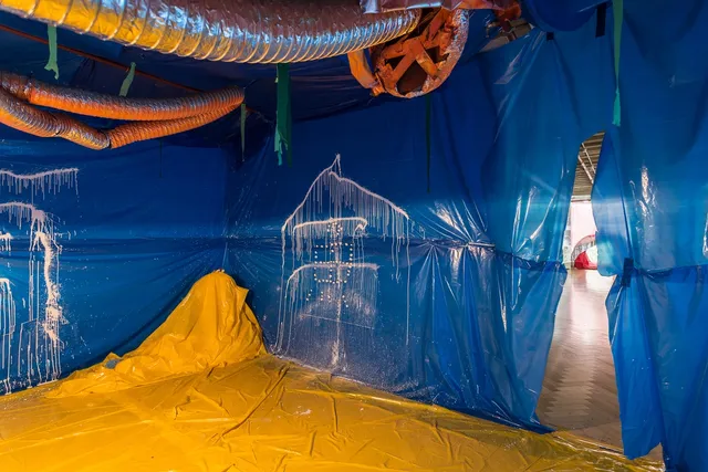 Comprised of large-scale murals and all-consuming sculptures, Phu’s installation blurred the line between the real and spiritual worlds, flickers of memories, and vivid psychological states.