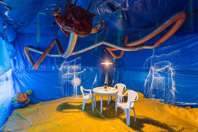 Plunged into the psyche of rising artist Jason Phu is the gallery-wide installation my parents met at the fish market.
