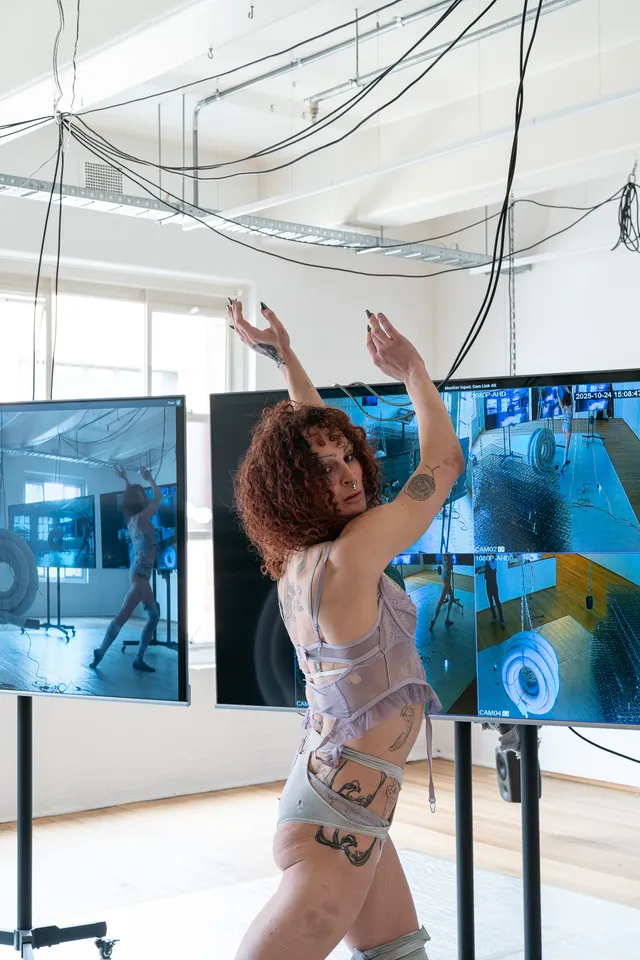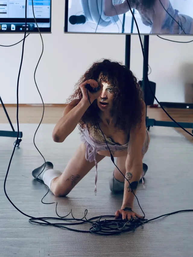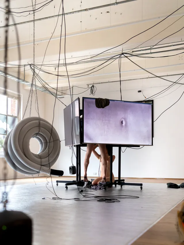 "Dreem2 engages with the relationship between looking and performativity and is a complex (futile) attempt to understand my body and what I experience — in public and private — and the affecting qualities of gazing and (mis) representation. It is an exploration of bodily failure; (dis) figuration; (im) balance; and the monstrous transfeminine; as modes of possibility and presence.