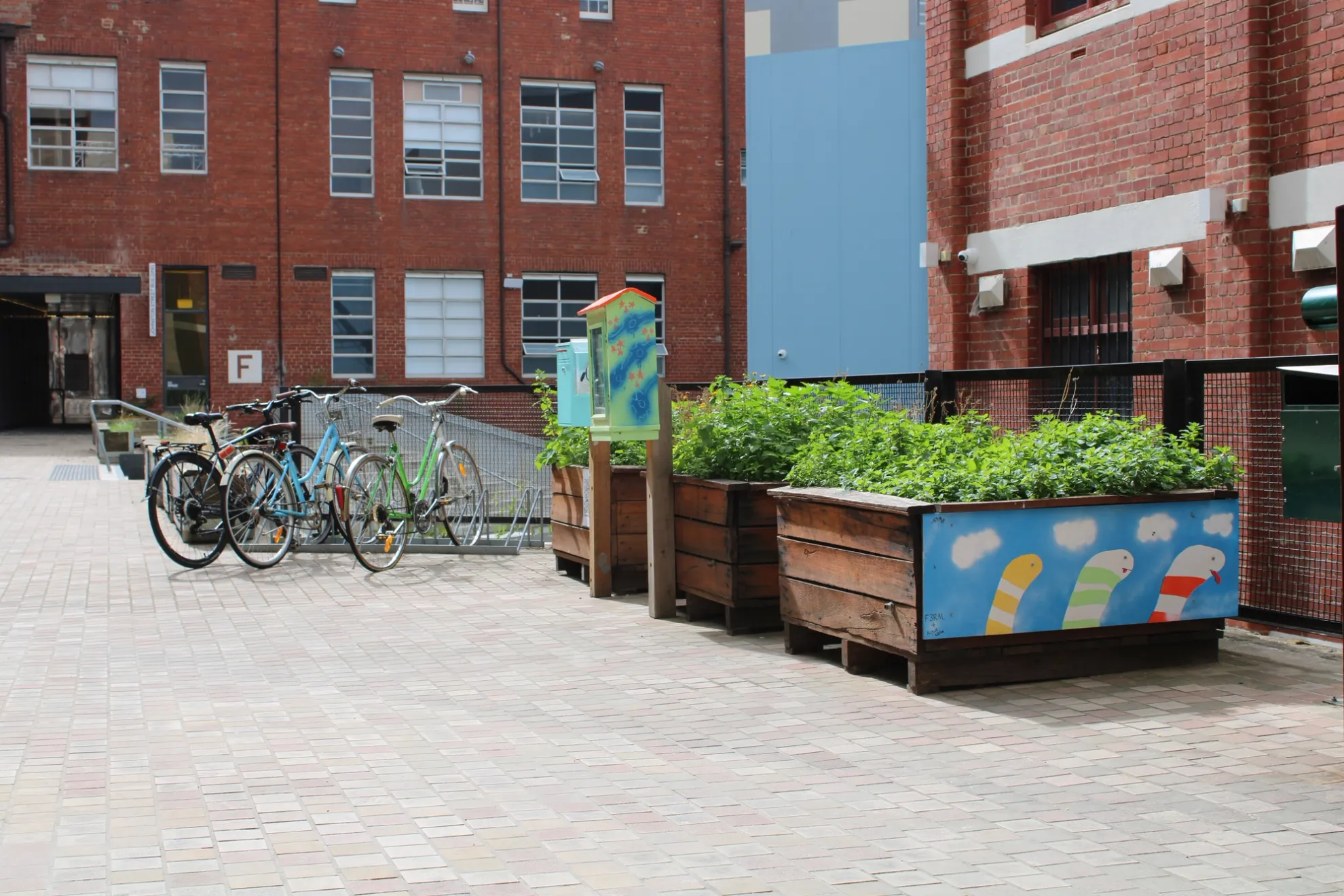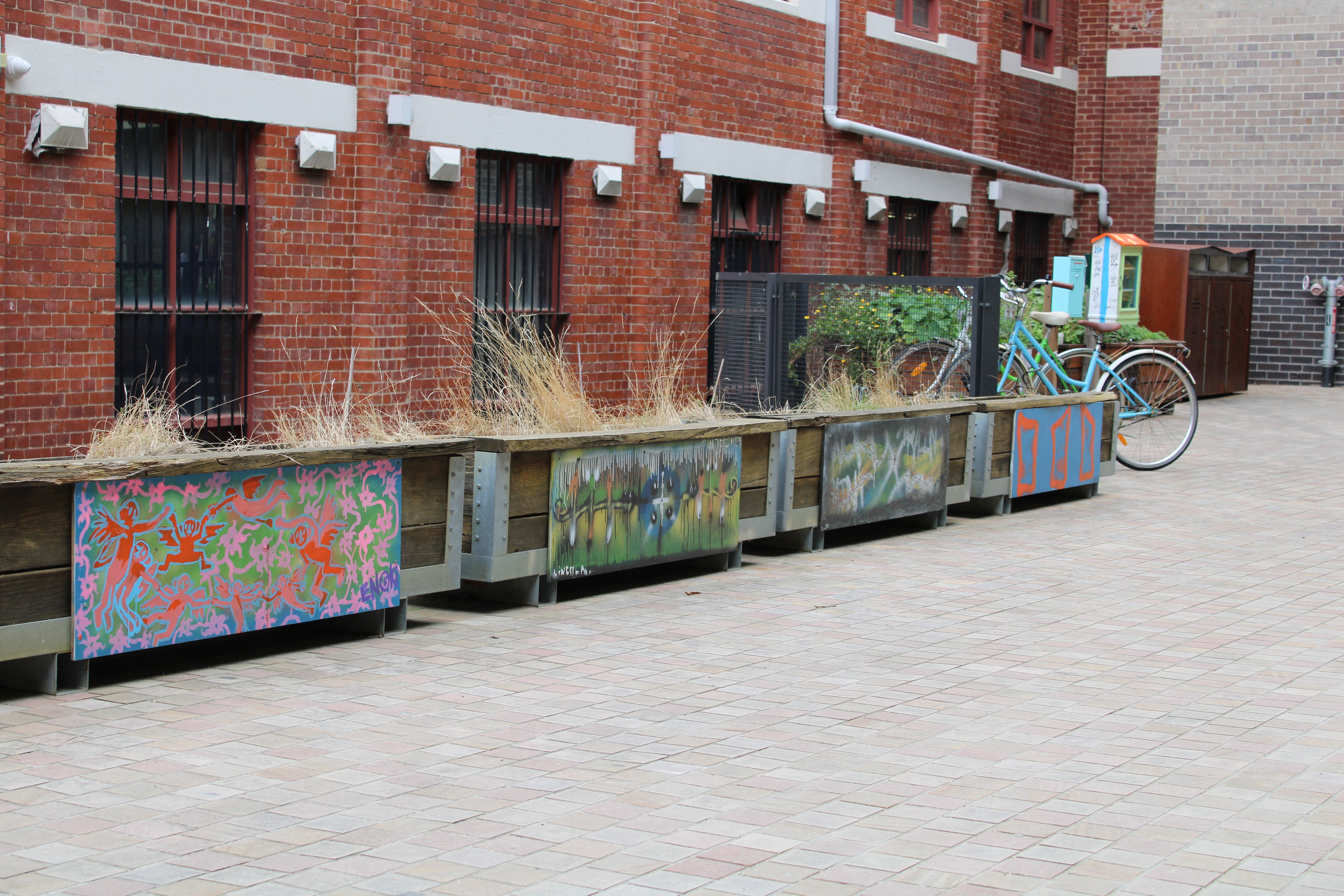 A series of paintings were created for the planter boxes in Collingwood Yards as part of West Space's Overgrown project, an experimental, long-form collaboration between local artists and Yarra Youth Services, Fitzroy.