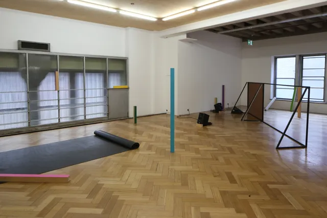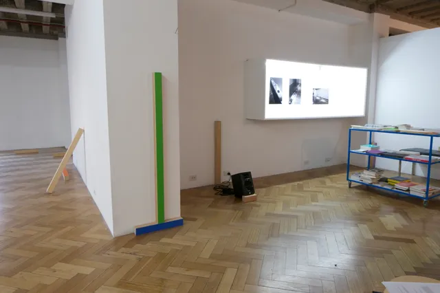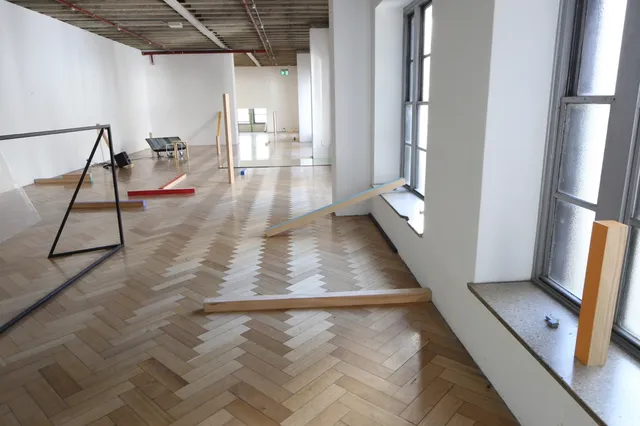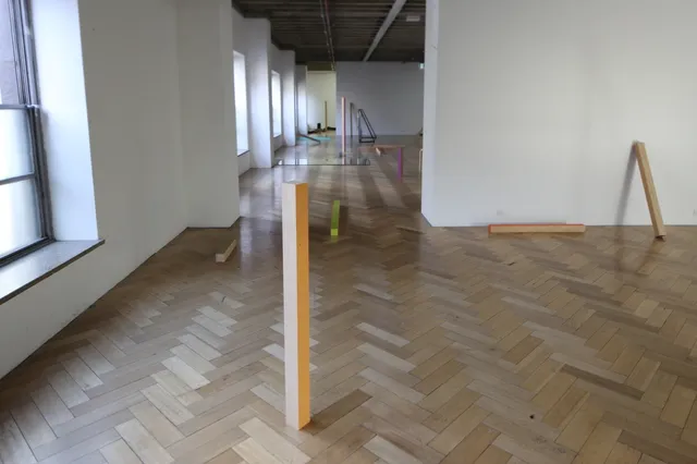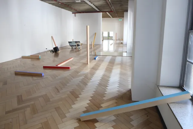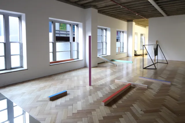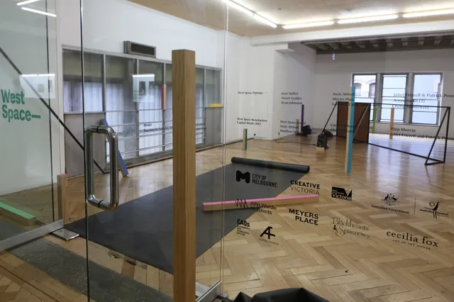 Using spatial markers (coloured wooden blocks), Geoff Robinson traces and highlights the architecture of the sites. The placement and contact/sounding of the spatial markers emphasise its form and material texture whilst each musician uses their instrument to sound out the acoustics of the room. The overlay onto West Space consists of the playback of the recordings of each site and the re-iterating of the collaborative performance of marking and sounding out the gallery.