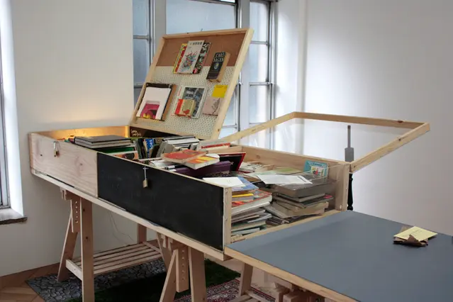 An assemblage of narrative pieces, snippets of conversation with visitors, excerpts from other texts and collage both written and visual comes together in an aggregation of references. The book’s ending is determined on the last day of the exhibition rather than by any demand of narrative or design.