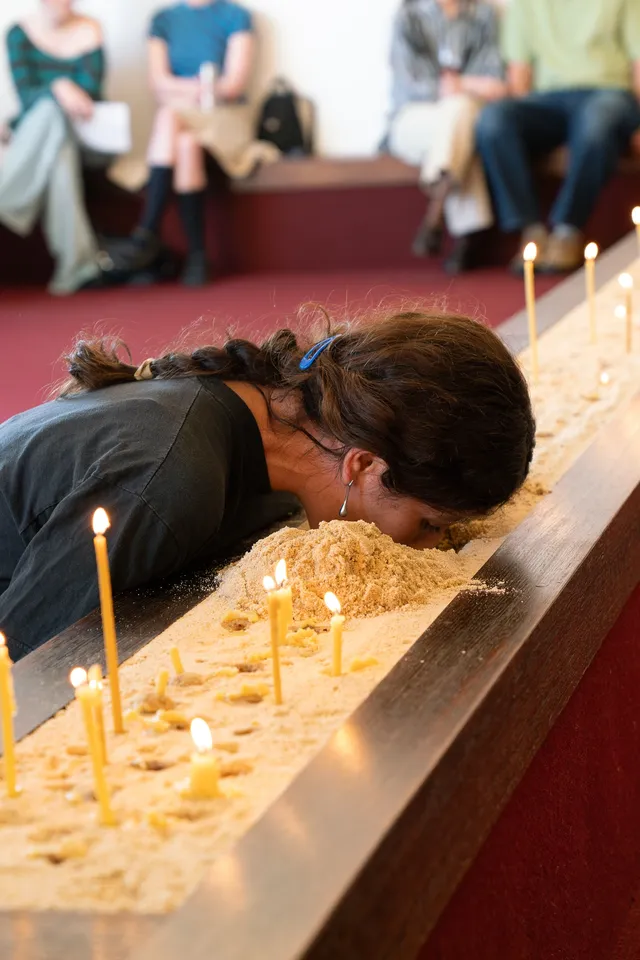 Motet Fail emerges from Stefanou’s early memories of learning to sing ‘straight’, over a single flame, steadying her breath and vibrato to produce pure notes and to not blow out the candle. Her vibrato, an engine filled with performative habits, identity, and selfhood, became disciplined through classical and jazz technical idioms. Here, Stefanou invites vocalists to inhabit Motet Fail with her and, through a series of live vocal actions, test the futile pursuit of perfection to the point of rupture.
